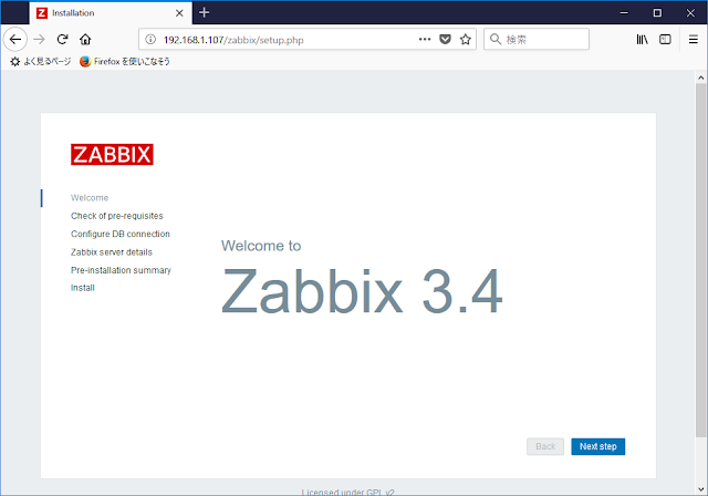 2.ブラウザからhttp://192.168.1.107/zabbix/にアクセスします。「Next Step」をクリックします。